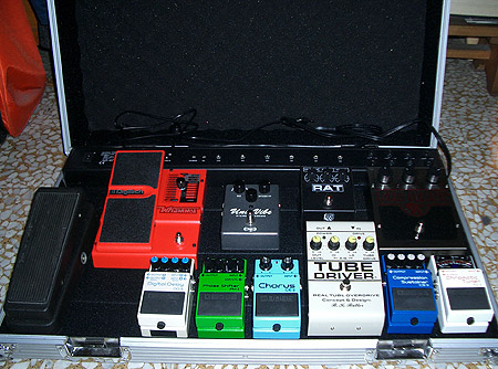 DEMETER COMPULATOR PRO, TUBE DRIVER BK BUTLER, CORNISH P2, MXR PHASE 90, MXR CARBON COPY, BOSS DD3 ( SOSTITUITA CON T REX REPLICA ), BOSS TU 3, BOSS GE 7 EQUALIZER, MXR STEREO CHORUS, EH DELUXE MISTRESS, UNIVIBE DUNLOP